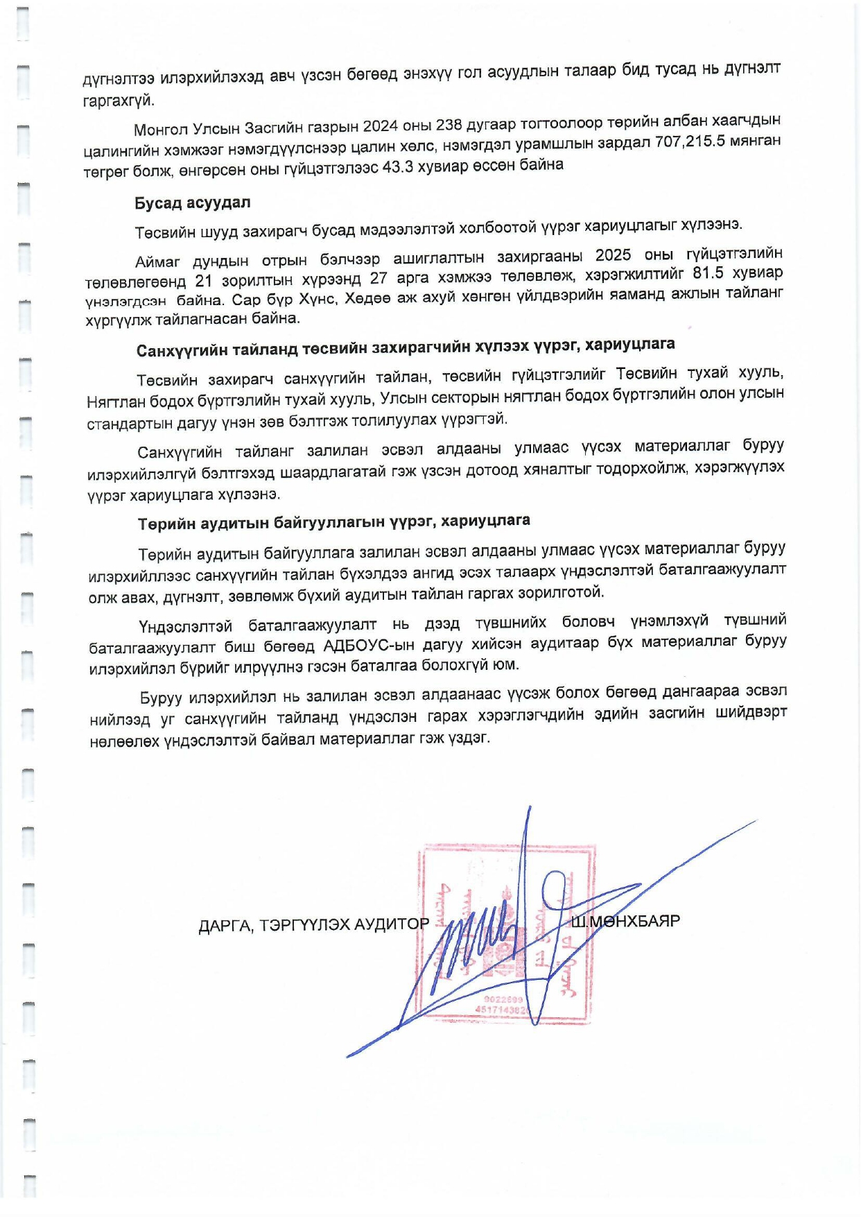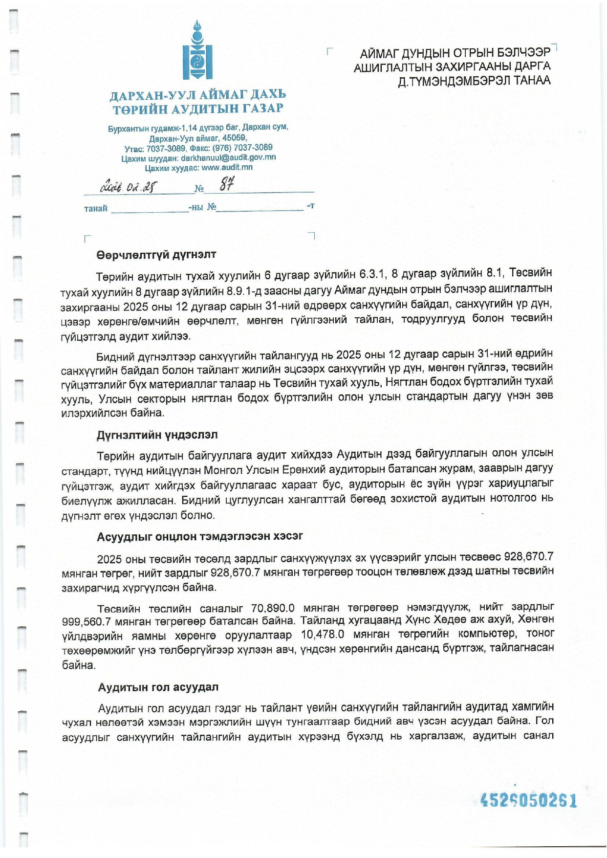Төрийн аудитын тухай хуулийн 6 дугаар зүйлийн 6.3.1, 8 дугаар зүйлийн 8.1, Төсвийн тухай хуулийн 8 дугаар зүйлийн 8.9.1-д заасны дагуу Аймаг дундын отрын бэлчээр ашиглалтын захиргааны 2025 оны 12 дугаар сарын 31-ний өдрийн байдлаар санхүүгийн байдал, санхүүгийн үр дүн, цэвэр хөрөнгө/өмчийн өөрчлөлт, мөнгөн гүйлгээний тайлан, тодруулгууд болон төсвийн хүрээнд хийгдсэн аудитын хүрээнд санхүүгийн үр дүн, мөнгөн гүйлгээ төсвийн гүйцэтгэлийг бүх материаллаг талаар олон улсын стандартын дагуу үнэн зөв илэрхийлсэн бөгөөд Өөрчлөлтгүй гэсэн дүгнэлт гарав.