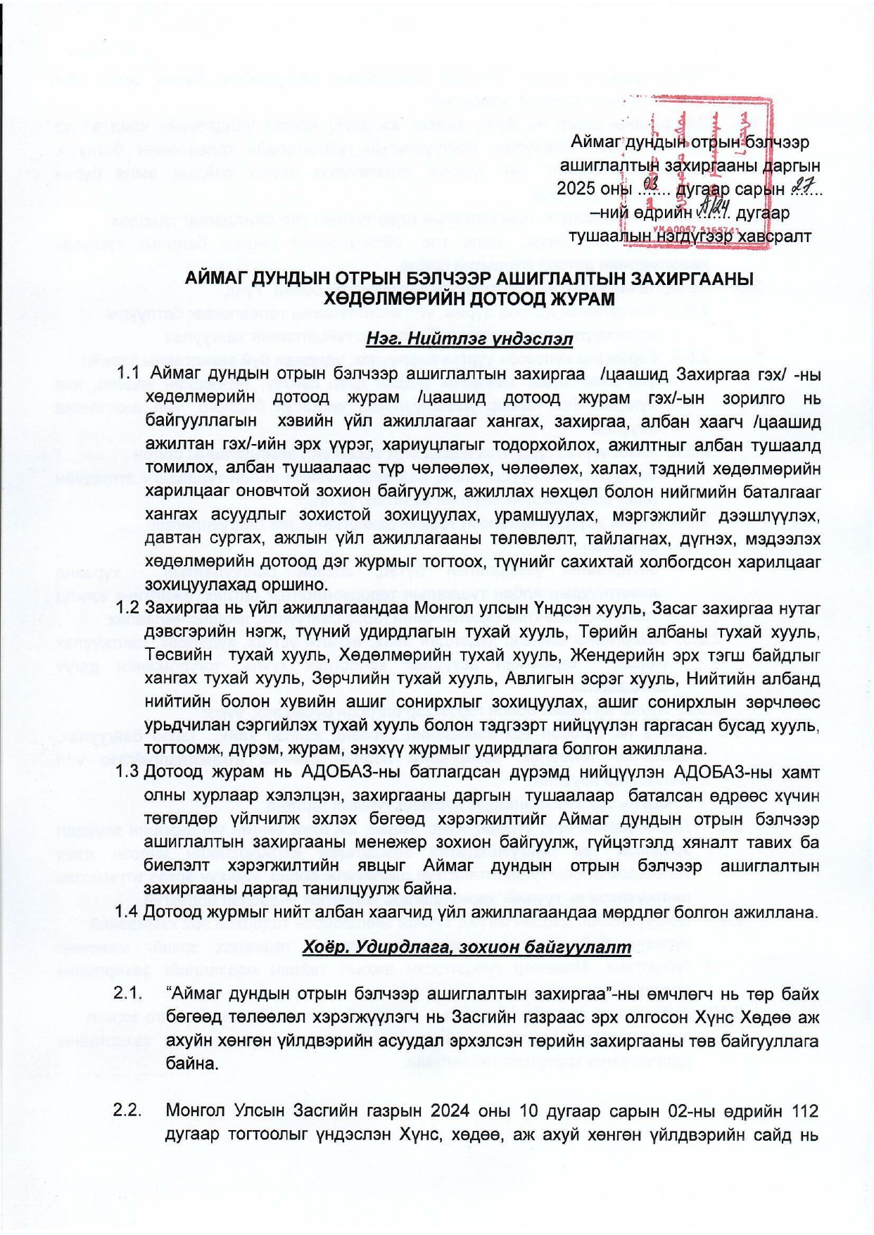 АЙМАГ ДУНДЫН ОТРЫН БЭЛЧЭЭР АШИГЛАХ НИЙТЛЭГ ЖУРАМ